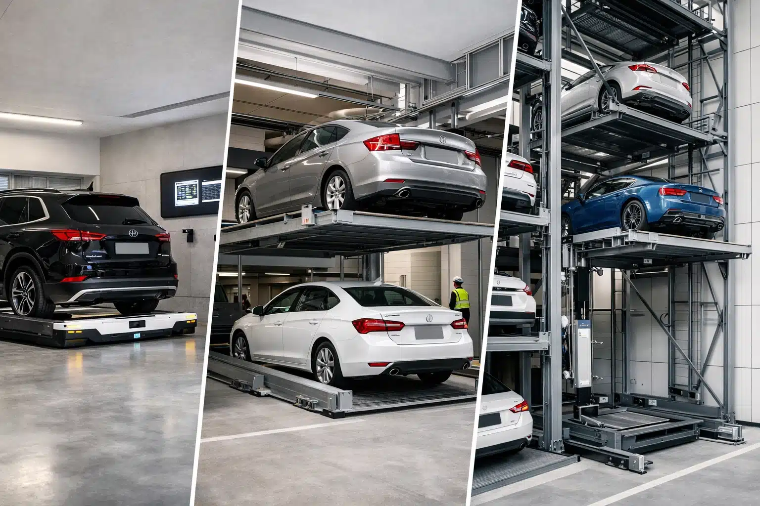 Car stackers provide a more accessible entry point into automated parking while still delivering substantial space savings. These semi-automated systems use hydraulic or mechanical lifts to stack vehicles vertically, typically in two or three-level configurations.